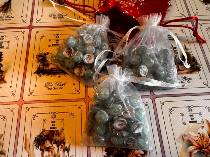 • Dieses Set besteht aus insgesamt über 110 gar zauberhaften runden Glaskuppeln / türkis-goldenen Fassungen, die mit Aquarellzeichnungen der einzelnen Lenormand, Tarot Symbole verziert sind.