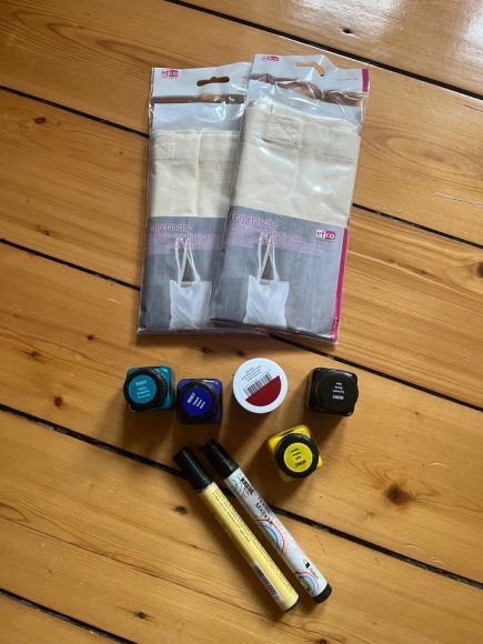 Dazu ein paar angebrochene Stoffmalfarben und 2 schwarze Stifte.