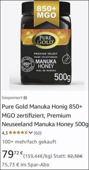 Pure Gold Manuka-Honig 850+ 500g, Honig aus Neuseeland, MBO-zertifiziert und nach MPI-Standards - 79,72 EURO