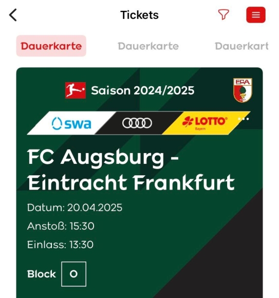 Biete ein Tagesticket für das heutige Spiel FCA - Eintracht Frankfurt im O-Block