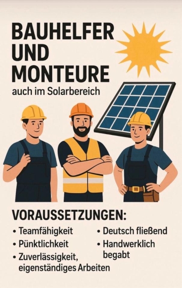Wir suchen ab sofort mehrere zuverlässige Personen zur Unterstützung bei der Montage von Solaranlagen.