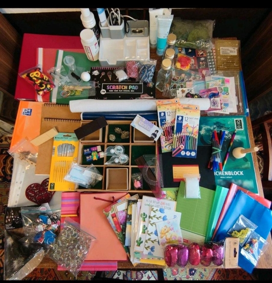 Dieses umfangreiche Set beinhaltet verschiedenste Bastelmaterialien sowie Hefte, Stifte, Ordner und Folien.