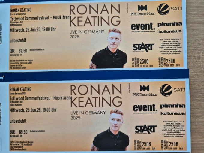 Ich verkaufe 2 Tickets für das Konzert von Ronan Keating am Mittwoch, 25.05. ab 19 Uhr auf dem Sommer Tollwood in München.