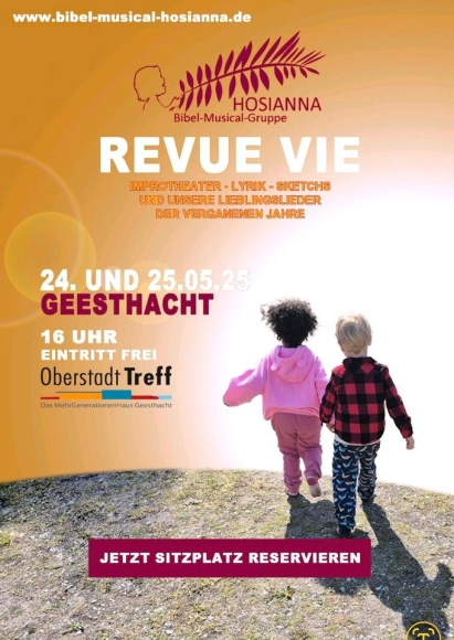 Unsere Gruppe „Hosianna“ bringt am 24. & 25. Mai um 16 Uhr eine ganz besondere Revue auf die Bühne: Improtheater, Lieder, Sketche und echte Herzensmomente – mit Menschen von jung bis alt.