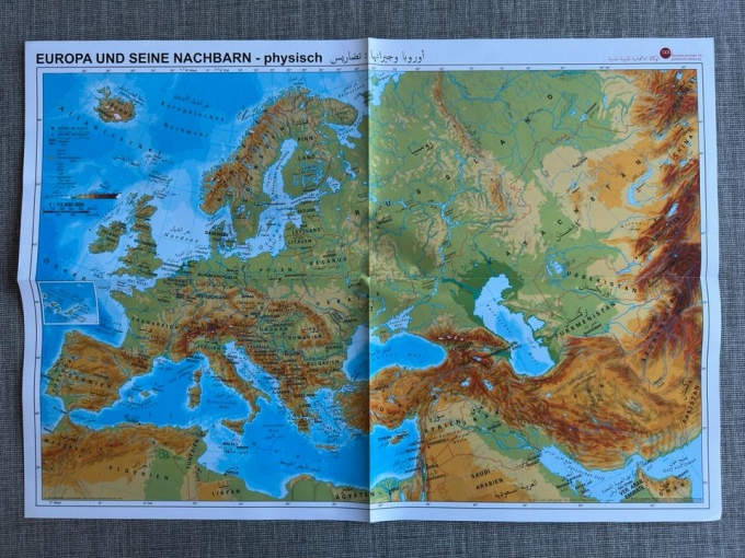 Die Karte zeigt auf der Vorderseite die Staaten Europas politisch. Auf der Rückseite befindet sich eine physische Darstellung des Kontinents. Beide Darstellungen sind in deutscher und arabischer Schrift und haben den Maßstab 1:12.000.000 bei einem Format von ca. 60 x 40 cm (gefalzt).