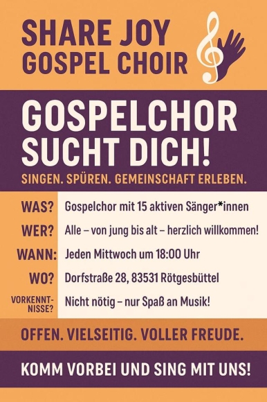 Hast du Lust zu singen, dich zu bewegen und gemeinsam mit anderen auf der Bühne zu stehen? Dann komm vorbei – ganz ohne Druck und mit viel Spaß!