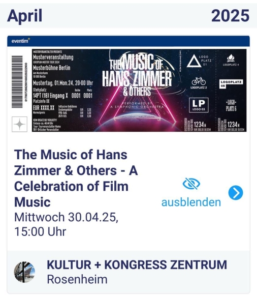 Ich habe 2 Tickets für das Konzert „The Music of Hans Zimmer & Others“ und kann leider aus beruflichen Gründen nicht hingehen.