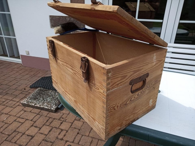 eine handwerklich exakt gebaute Holzkiste, innen verkleidet,
