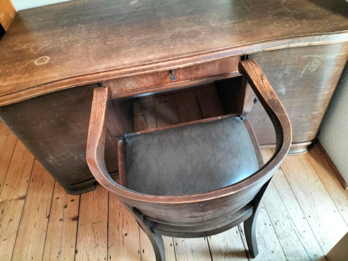 Schreibpult und Stuhl wurden in den 30er Jahren aus Massivholz angefertigt.