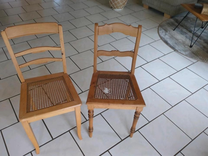 Beide Stühle sind aus Hartholz und haben ein Korbgeflecht als Sitzfläche.