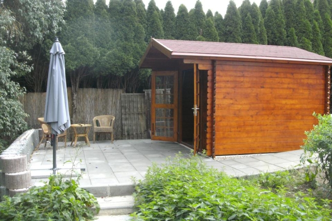 Das Gartenhäuschen (massive Holz-Variante mit 34 mm Wandstärke, Holzfußboden, Außenfläche incl. Dachüberstand ca. 3 x 4 Meter, mit Schindeln eingedeckt) sowie die Terrasse davor ist für die Pächter sehr zweckdienlich als Rückzugsmöglichkeit, Ruheort & Wetterschutz.