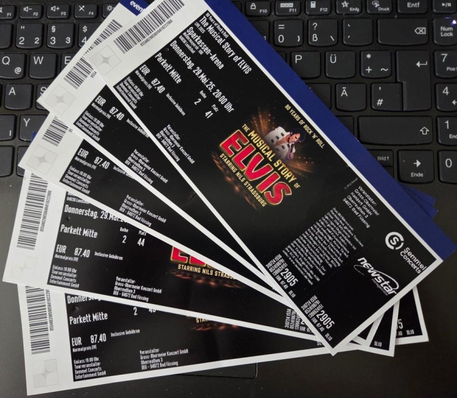 Biete 5 super Plätze, Parkett Mitte Reihe 2, für 'The Musical Story of Elvis' in der Sparkassen-Arena in 84036 Landshut, am Donnerstag, den 29.05.2025, 20.00 Uhr, mit dem sensationellen Elvis-Darsteller Nils Strassburg, da ich selbst leider verhindert bin. Machen Sie mir ein faires Angebot und die Karten gehören Ihnen.
