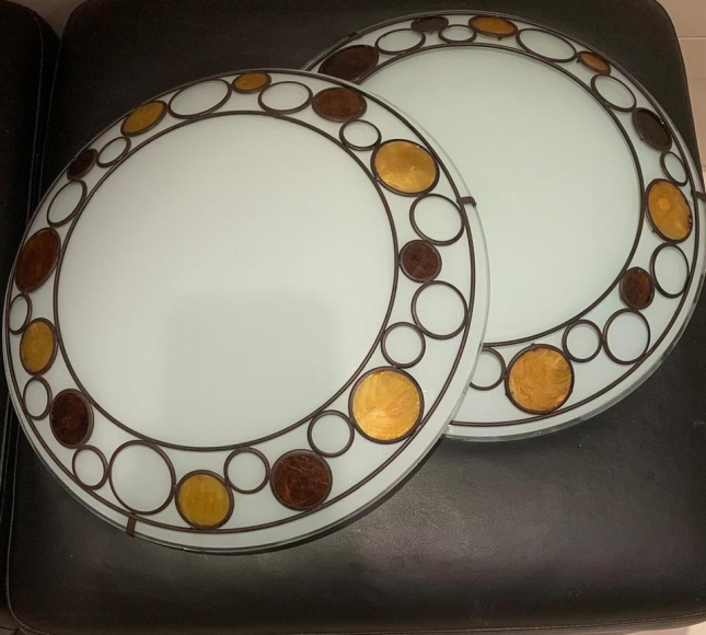 Deckenleuchte, 2 Stück, EGLE, satiniertes milchig-weißes Glas, Metall, abnehmbares Metallornament auf den Glasschirmen. Maße auf dem Foto. Preis für 1 Stk. Lieferung auf Kosten des Empfängers oder Selbstabholung. Privatverkauf, keine Gewährleistung.