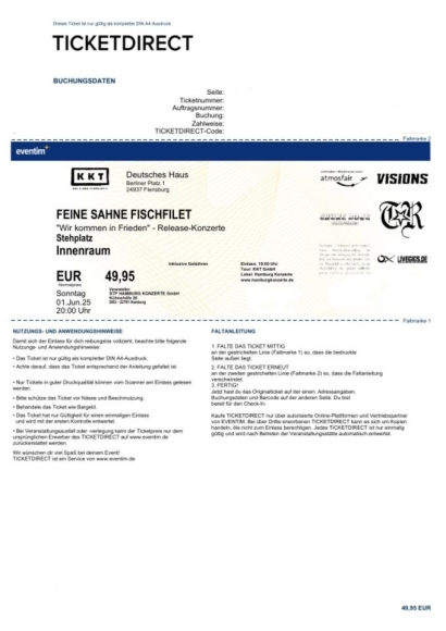 Wir haben 2 Stehplatz-Tickets zum Originalpreis für das Konzert von Feine Sahne Fischfilet am Sonntag, den 01.06.2025, um 20:00 Uhr in Flensburg abzugeben. Es sind Innenraum-Tickets, perfekt für die beste Stimmung und Nähe zur Bühne!