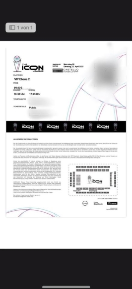 Ich verkaufe hier ein VIP Ticket für 2 Personen von der Icon Leauge am 22.04.2025
