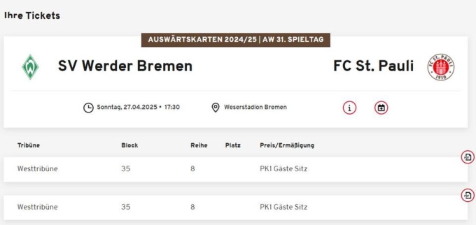 Verkauf von zwei Gästekarten für das Spiel in Bremen. Verkauf nur an St. Pauli Mitglieder. Karten nur im Doppelpack. Preis im Paket 125€. Tickets sind Sitzplätze nebeneinander. Verkauf privat unter Ausschluss von Gewährleistung. Versand als PDF per Mail.