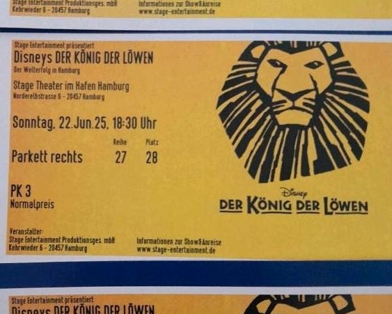Leider habe ich mich bei der Buchung der Karten für König der Löwen im Datum vertan und kann sie nicht stornieren. Die drei Plätze sind nebeneinander und die besten zu der Zeit der Buchung buchbaren Plätze in der Kategorie. Originalpreis sind 96€ pro Karte. Es ist auch möglich nur eine oder zwei Karten zu kaufen, dann für 90€ pro Karte