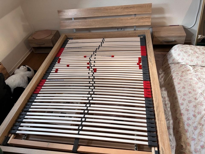 Ich verschenke ein gut erhaltenes Bettgestell ohne Matratze, inklusive zwei Nachttischen, kostenlos an Selbstabholer.