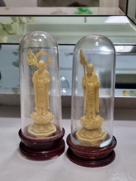 Buddha-Figuren mit Holzsockel + Plexi- Glas-Vitrine gebraucht