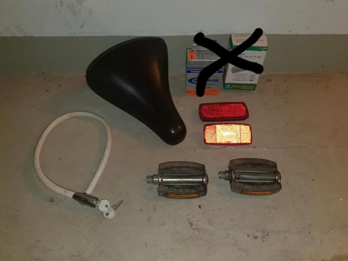 ich verkaufe hier ein Fahrradsattel in Schwarz ,der wurde nicht so oft benutzt, dazu biete ich noch einen Fahrradschloss , 2 Rückbeleuchtung und 2 Fahrrad Pedale , teil von den ist benutzt und teil ist unbenutzt ( sehe foto )