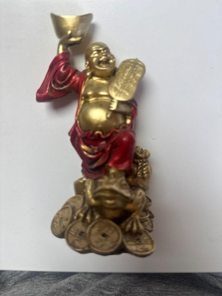 Sowie eine Buddhafigur ca. 11 cm hoch und Münzen an der Kette (für Reichtum)