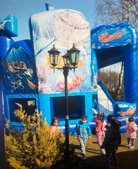 Die Kinder können auf der Hüpfburg Hüpfen, klettern, rutschen und parkour laufen.