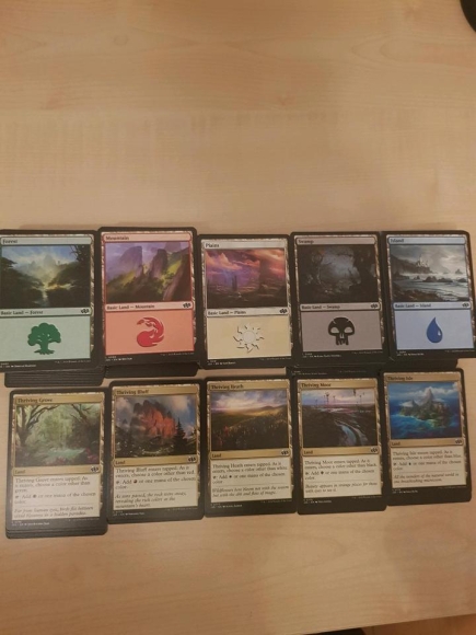 Je Basic Land Typ ungefähr zwischen 90 und 100 und je 10 der entsprechenden Thriving Länder.