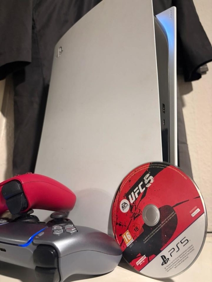 Verkaufe wie zusehen eine ps5 mit den Controllern und ein Videospiel .