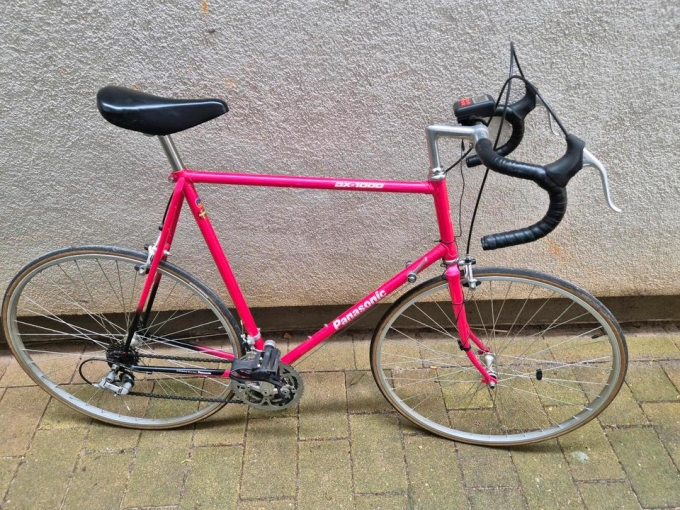 Zum Verkauf steht mein Panasonic DX1000 Rennrad aus den frühen 80er Jahren in einem wunderschönen rosa. Das Rad hat die originale 2x6 Shimano Exage 300EX Schaltgruppe mit 12 Gängen verbaut. Rahmenhöhe 63