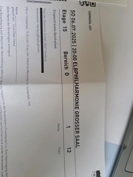 Ich biete 2 Tickets für das ausverkaufte Samara Joy Konzert im großen Saal der Elphi am 06.07.25 in Hamburg an.