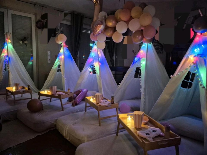Beinhaltet: 1x Tipi, Lichterkette, Bettlaken, Matratze, Frühstückstablett, Schlafmaske, Nachtlicht