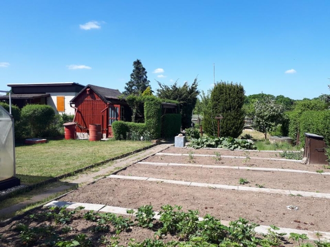 Der Garten hatbein kleines Holzhaus mit Terrasse, einen Geräteschuppen und einen kleinen Teich. Das Gewächshaus hat bei einem Sturm gelitten und müsste repariert werden, damit es voll einsatzfähig ist. Strom vorhanden. Wasser über Brunnenversorgung.