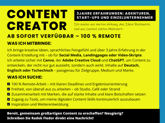 Ich bin Content Creator & Copywriter mit über 3 Jahren Erfahrung – auf der Suche nach neuen Projekten, Marken oder Teams, die mit starken Inhalten auffallen wollen.