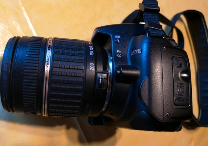 Verkaufe an Abholer diese gut erhaltene 12 MP Spiegelreflexkamera Nikon D5000 mit praktischem Tamron 1:3,5-6,3 18-200 mm Reisezoomobjektiv, Tragegurt, Ladegerät und Speicherkarte.