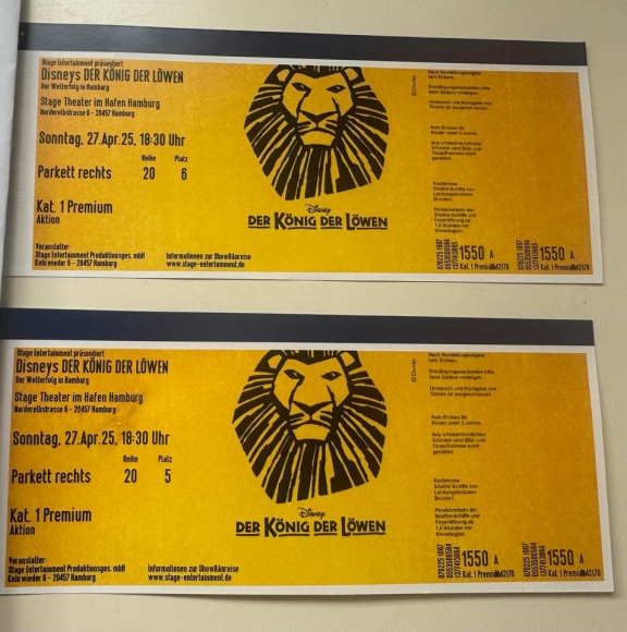 Ich biete zwei Tickets für das Musical Disneys König der Löwen am 27.04.2025 um 18:30 Uhr im Stage Theater im Hafen Hamburg an. Kategorie 1 Premium. Gekauft bei Ticket Online Sales & Service Center GmbH, Original Tickets von Eventim.