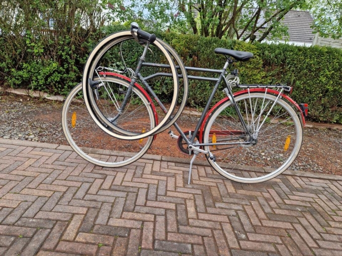 Sehr passabler Zustand nach 30 Jahren durchschnittlicher Nutzung. Nachgerüstet: Sachs-Siebengang-Nabenschaltung (Daumenschalthebel); ABUS-TRELOCK-Schloss. Hinterrad-Schutzblech nachrepariert.