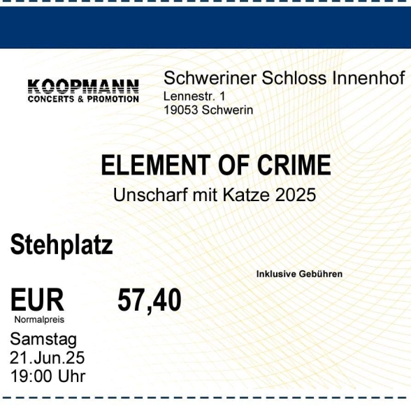 Ich verkaufe hier zwei Karten für das Element of Crime Konzert in Schwerin am 21.06.2025.