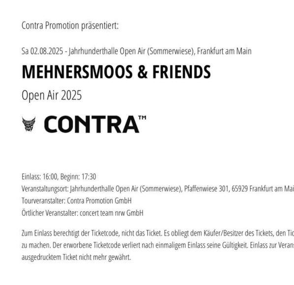 2 Tickets Mehnersmoos 02.08. Frankfurt