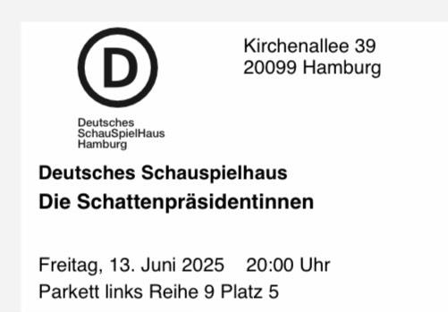 Abzugeben sind zwei Theaterkarten für die Vorstellung am Freitag, den 13.6.25: die Schattenpräsidentinnen im deutschen Schauspielhaus in Hamburg.