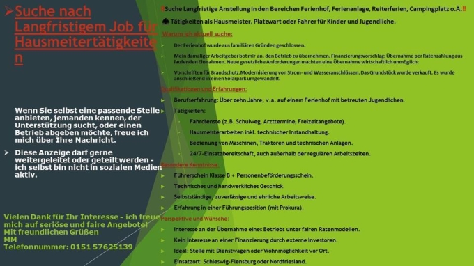 ich suche eine langfristige Anstellung als Hausmeister oder Platzwart im Bereich Ferienhof, Ponyhof, Campingplatz oder in ähnlichen Einrichtungen. Ebenso stehe ich für Fahrdienste für Kinder und Jugendliche zur Verfügung, beispielsweise für Schulfahrten, Einkäufe oder Ausflugsbegleitungen.