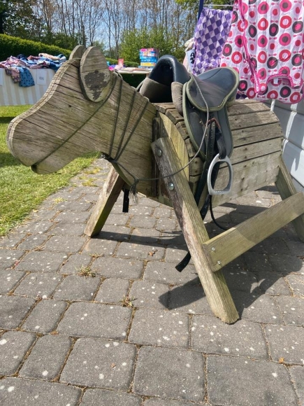 Süßes kleines Gartenpferd mit Sattel und Steigbügeln.