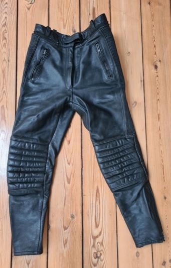 Zum Verkauf steht eine Damen-Motorradjacke in Größe 42 sowie eine passende Motorradhose in Größe 40, beide aus Leder. Die Lederkombi ist gebraucht, befindet sich jedoch in einem guten Zustand