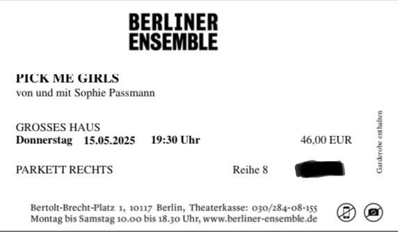 Ich habe ein Ticket für Pick Me Girls von und mit Sophie Passmann am Do. 15.05. um 19:30 Uhr im Großen Haus des Berliner Ensembles abzugeben.