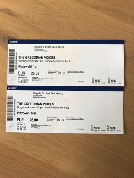 Zum Verkauf stehen 2 Tickets für das Konzert der Gregorians in Glücksburg, am 11.06.25 , um 19:00.