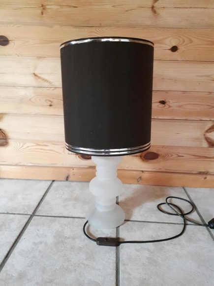 Dekorative Tischlampe mit weiß satiniertem Glasfuß und dunkelbraunem Schirm.