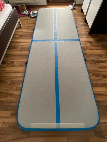 Zusätzlich zu der Airtrack kommen die Pumpe, der Airblock und zusätzliches Zubehör, wie z.B. Flickzeug oder andere Aufsätze für die Pumpe.