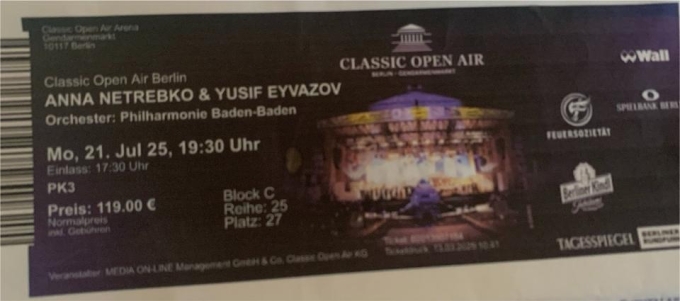 Am 21.07.2025 Konzert Classic Open Air in Berlin am Gendarmenmarkt mit Anna Netrebko & Yusif Eyvazov. Würde sehr gerne diese Veranstaltung besuchen aber aus gesundheitlichen Gründen kann ich es leider nicht. Preis gilt für beide Karten.