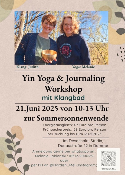 Am Samstag 21.Juni 2025 möchten wir Dich zu unserem Yin Yoga und Journaling Workshop mit Klangbad ins wunderschöne Devashakti Studio in Damme einladen.