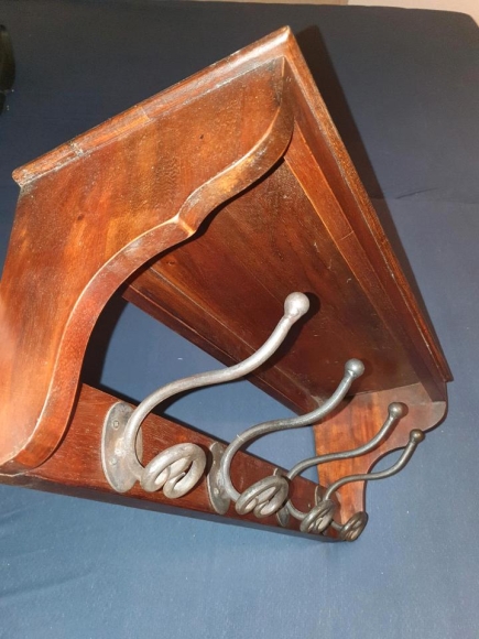 angeboten wird eine antike Garderobe, mit vier geschmiedeten Garderobenhaken. das Holz ist vermutlich Kirsche Eiche oder Teak. ich tendiere am ehesten zur Kirche, kann es aber nicht mit Gewissheit sagen. Abmessungen seht ihr in den Bildern.