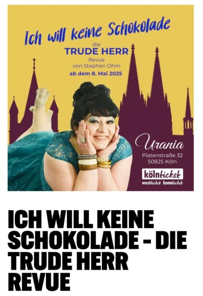 2 Karten für „Ich will keine Schokolade“ - Die Trude Herr Revue im Kölner Urania Theater abzugeben. 30€ pro Ticket, freie Platzwahl. Kostenloser Versand der Tickets.